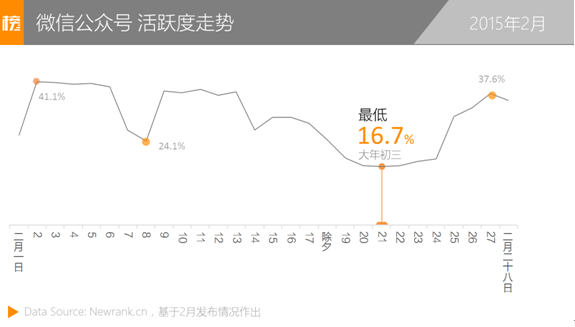 在2月期间,活跃度最低的一天为大年初三,这一天总样本当中仅有16.7%的账号推送了图文内容。春节期间,活跃比明显降低,并在春节结束后快速回暖。