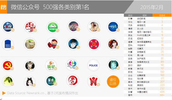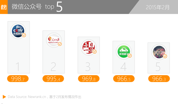 基于全样本账号数据, 2015年2月,居于中国微信500强前五位的是:央视新闻、人民日报、每日一读、微信路况与女人坊。(整体样本情况见“样本说明”部分)