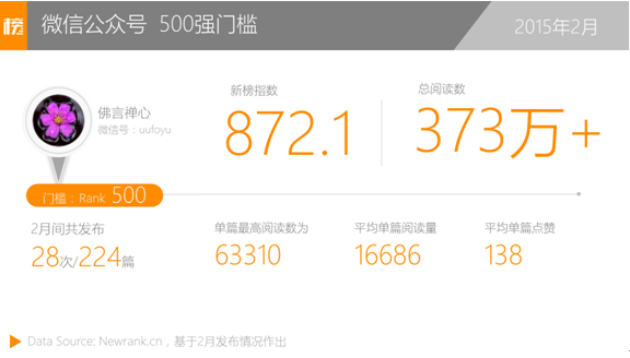 排在500强末位的是“佛言禅心”(微信号uufoyu),在2月间共推送28次,224篇。平均单篇阅读数为16,686,平均单篇获赞138个,新榜指数为872.1。