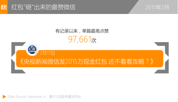2月17日(大年二十九),央视新闻推送的《央视新闻微信发2015万现金红包 还不看看攻略?》一文获取97,661次赞,为统计以来最高点,亦逼近点赞数理论极限值。