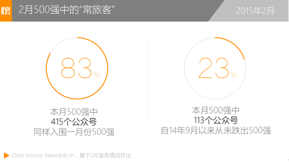 有415个1月500强成员在2月成功晋级,变化率较往月降低,500强名单比以往更趋稳定。自14年9月以来,有113个账号从未跌出500强,成为“常旅客”。